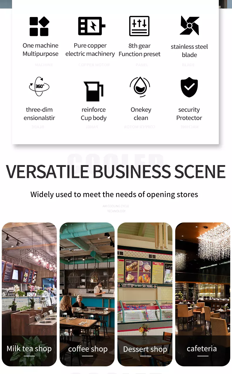 Ice Blender machine is a small electrical appliance specially used for making sand ice, cocktail, iced cappuccino, ice cream, milk shake, yoghurt, Sprite multi strawberry ice, strong flavor banana milk shake, coconut pineapple ice, orange honey papaya sand ice, fresh fruit sand ice and other ice drinks.