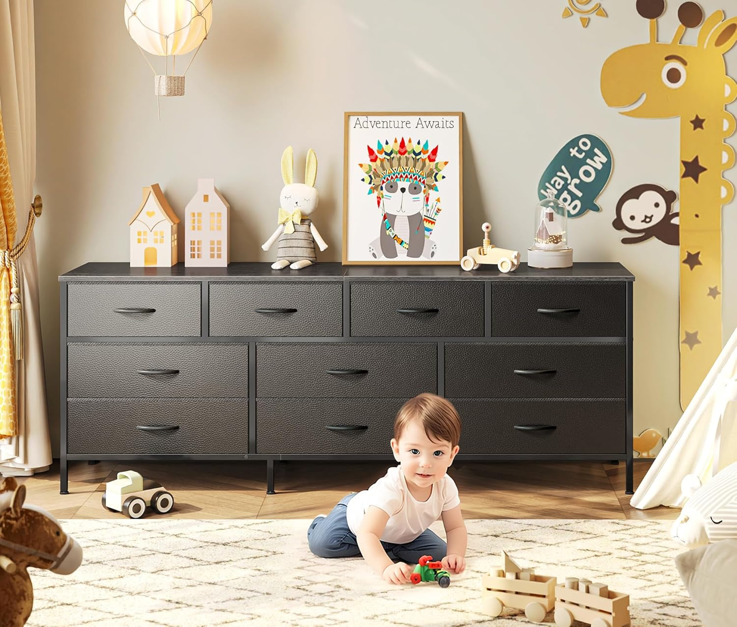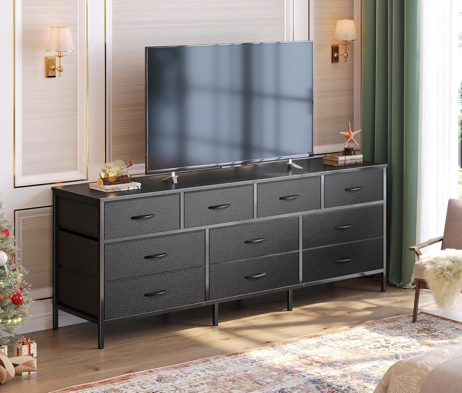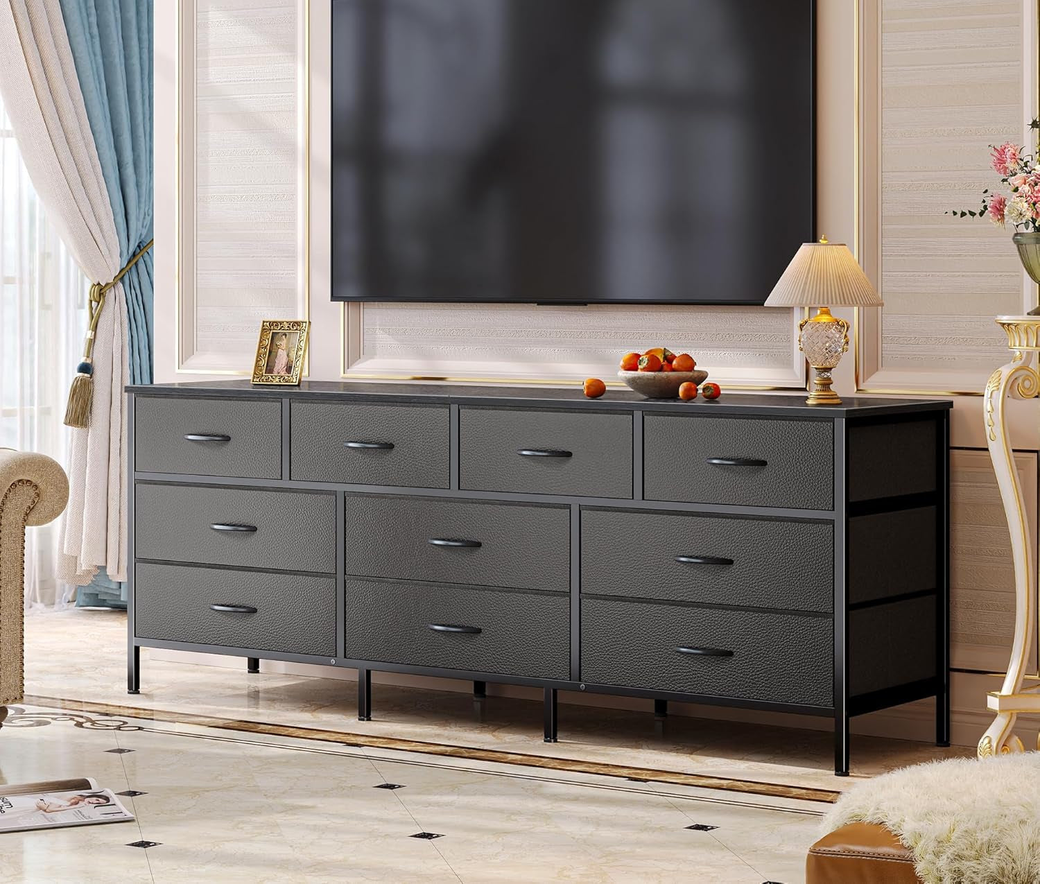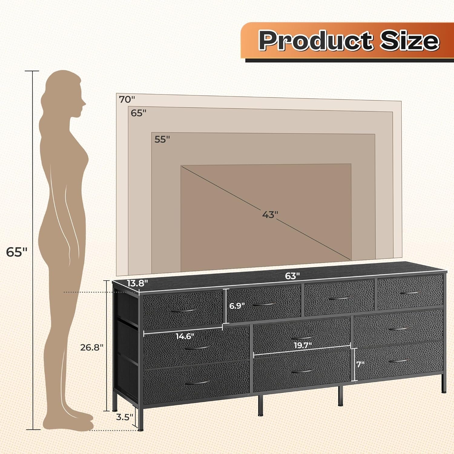 63 Inch TV Stand Dresser for Bedroom, Long Dresser with 10 Fabric