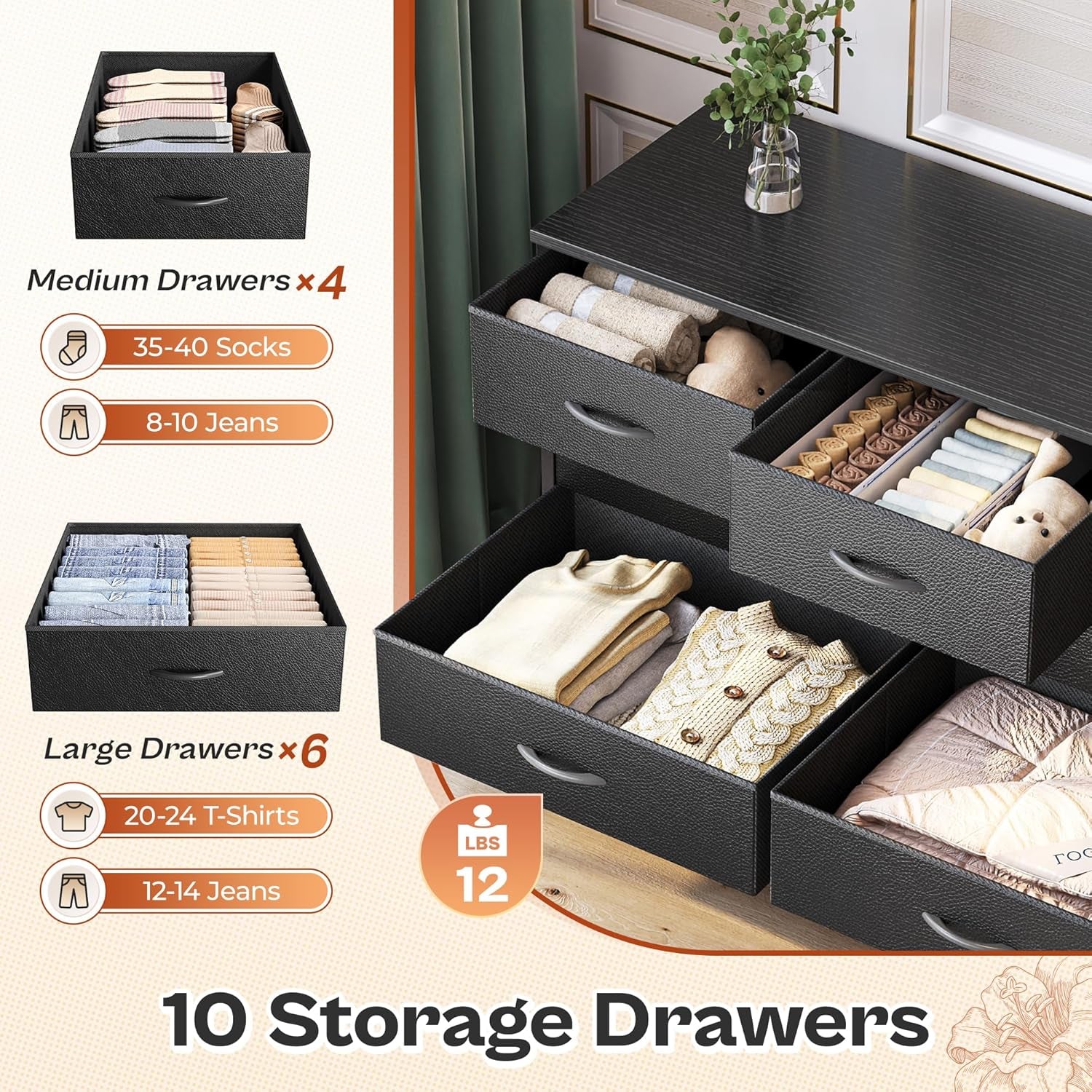 - 【10 Drawers Dresser】Tired of Messy Clothes Piles? This bedroom dresser is a storage solution. It's roomy enough to neatly stash all your clothing items like jeans, shirts, and sweaters. The 4 small drawers on top and 6 medium ones help you organize everything so you can easily find what you need, saving you the hassle of rummaging through a messy pile