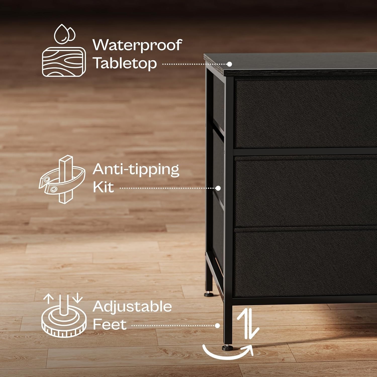 - 【Sturdy, Safe and Stable】Made from high-quality fabric, a sturdy wooden top, and a strong metal frame, this tv stand with storage is built to last. The easy-to-pull handles are convenient for everyone. The drawers slide smoothly, even for little hands. With included anti-tip kits, it stays put and keeps your children safe. The 8 adjustable feet not only keep it stable on any surface but also protect your floors from scratches