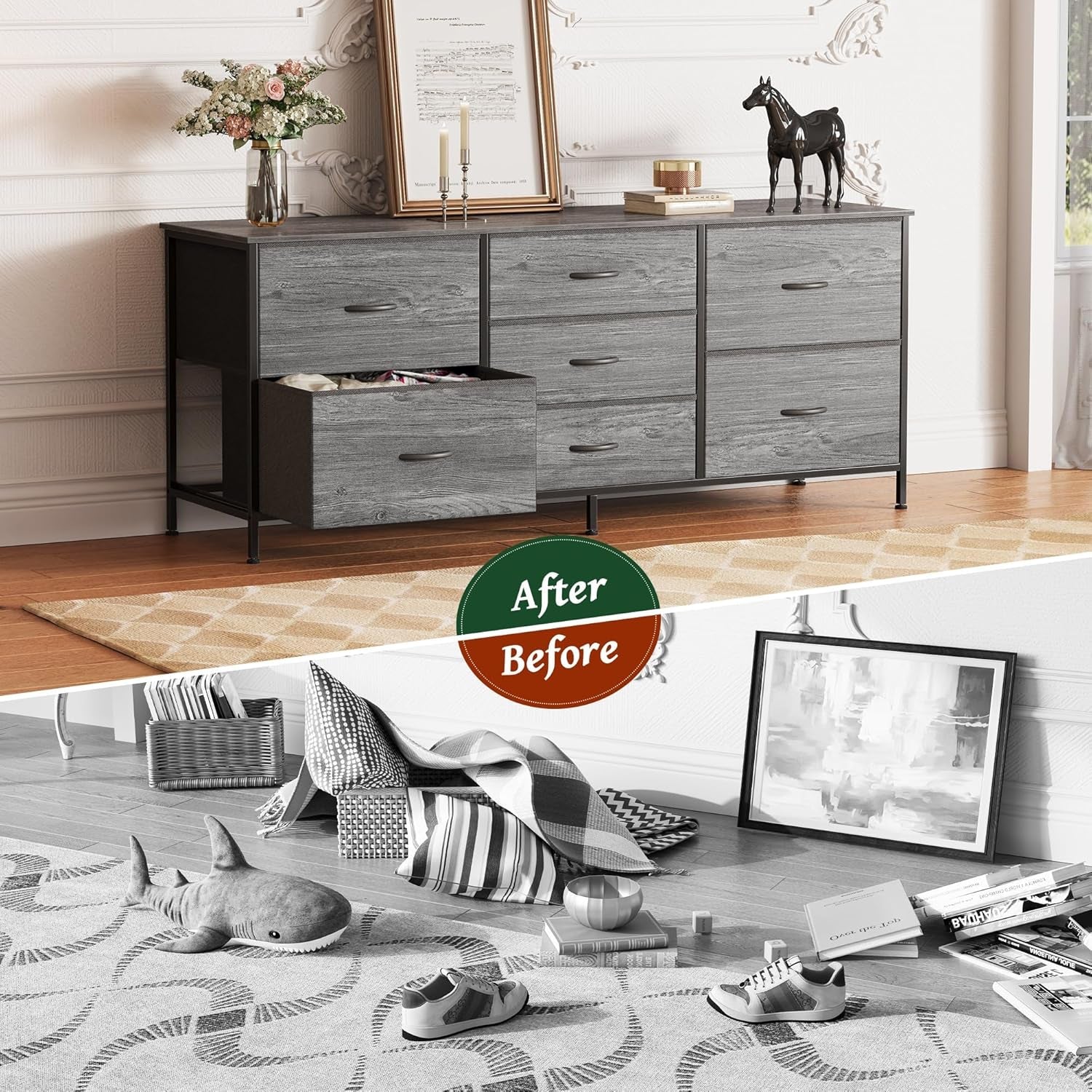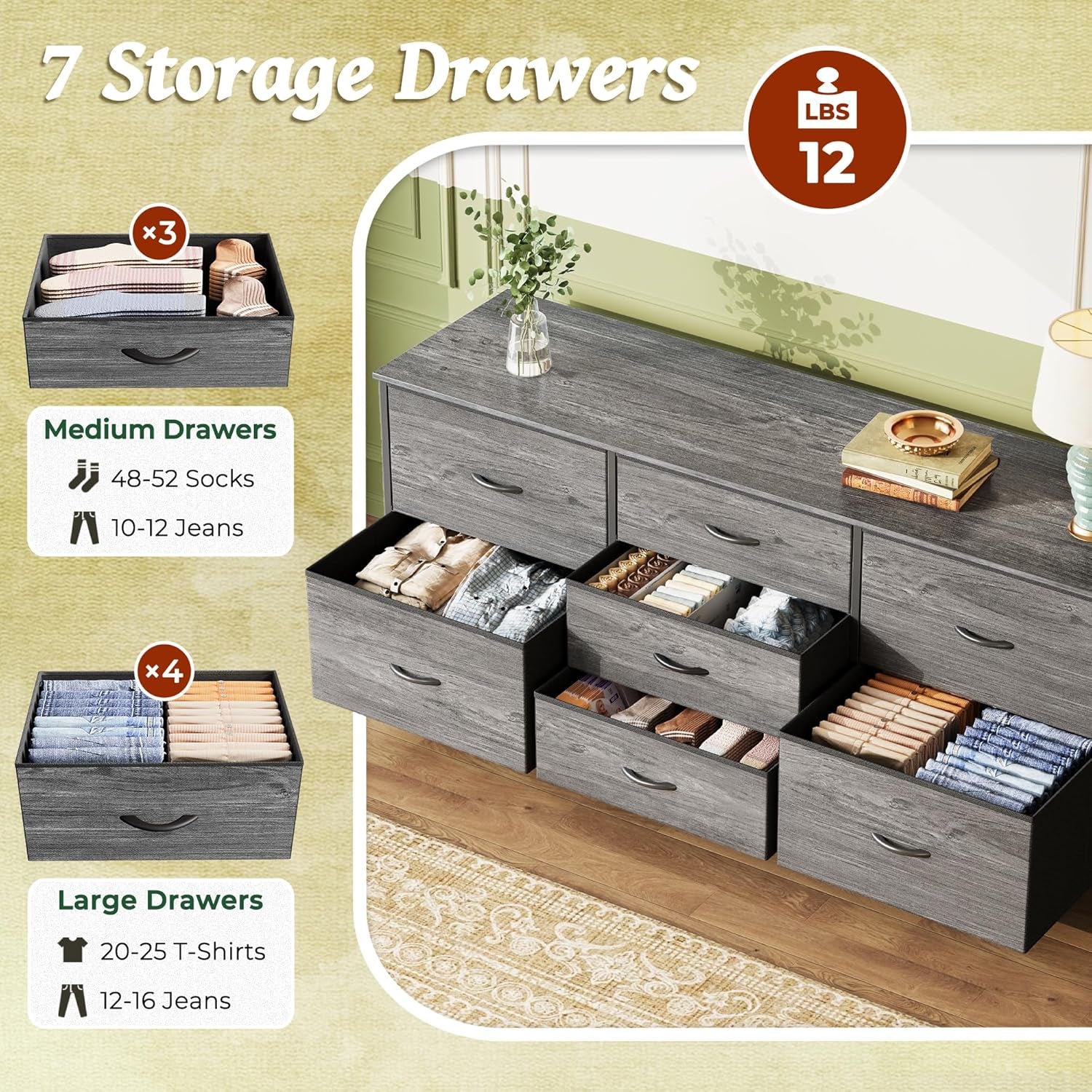- 【7 Divided Storage Fabric Drawers】This dresser for bedroom features 4 large side fabric drawers and 3 medium middle fabric drawers, offering a perfect solution for organizing your clothes, beddings, and TV accessories. No more searching through piles of clutter, everything has its place
