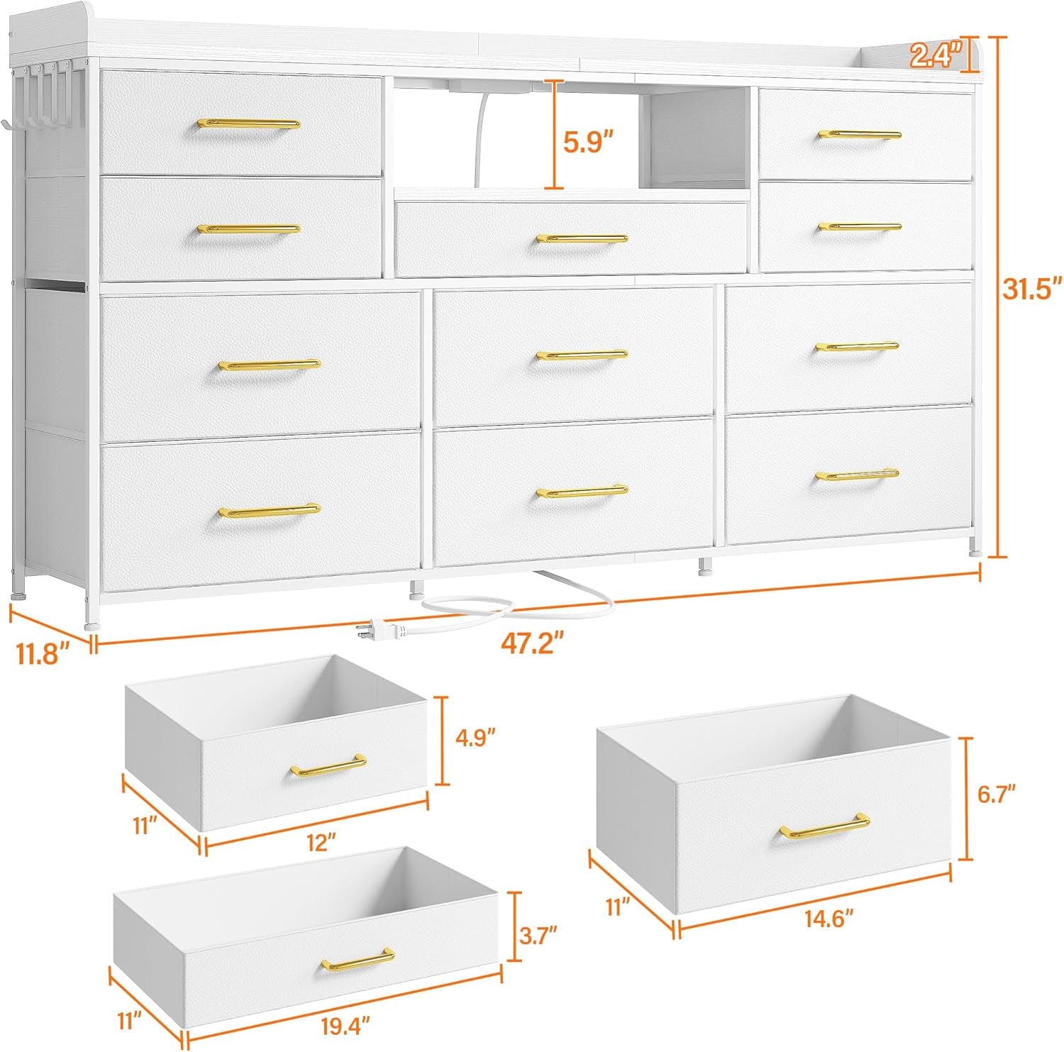 - More Secure Dresser TV Stand with Premium Material: This large dresser is made from sturdy metal frame and thicken wood top to provide stable support and ensure years of use. The chest of drawers is made of high-quality durable fabric drawers and handles, so the drawers can be pulled out and closed smoothly. Equipped with anti-tip kits to prevent the TV stand with drawers from dumping, which is friendly for your family. 6 adjustable feet can prevent wobbling on uneven floors and protect the floor from scratches.
