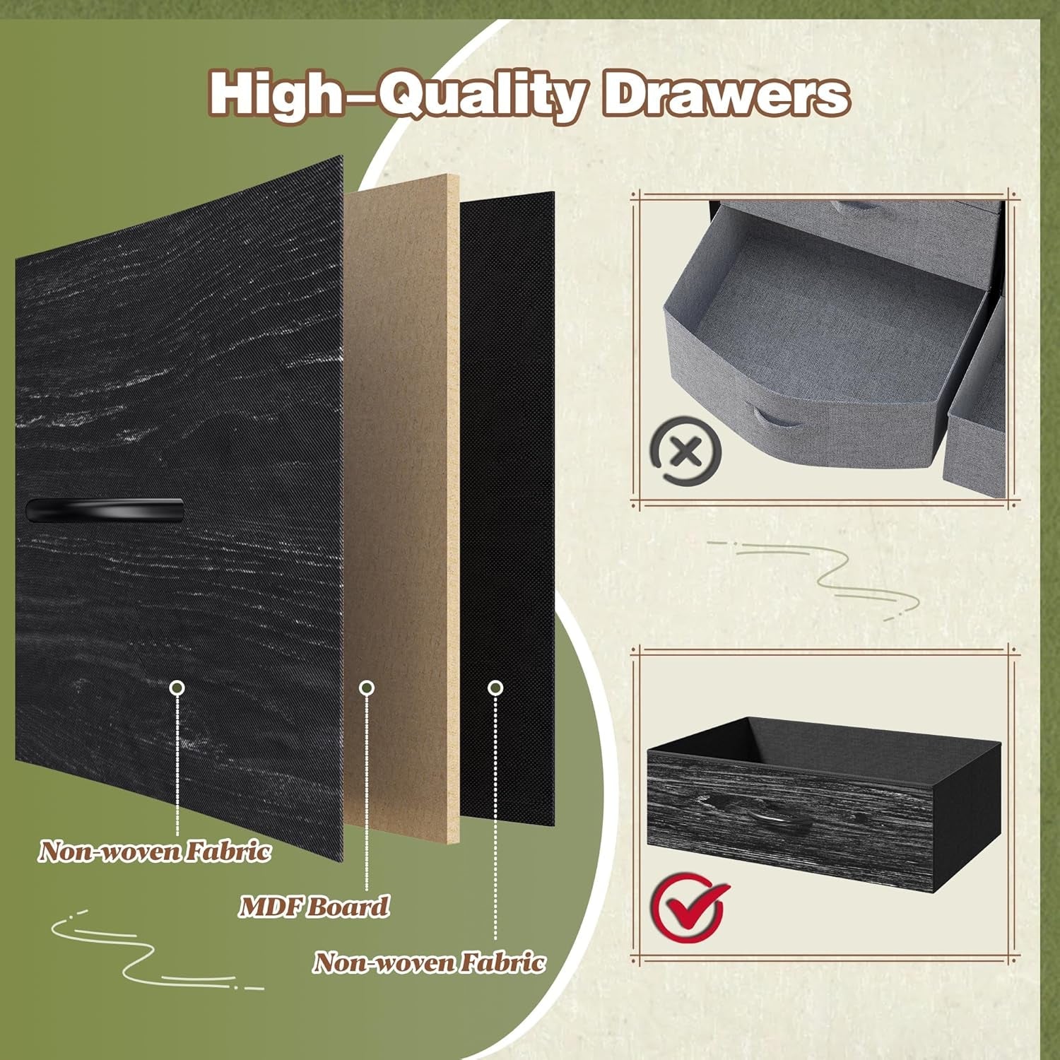 - Say Goodbye to Mess: This TV Stand for 60" TV features 9 foldable deep drawers. Dimension of 3 large drawers: 21''W X 14.6''D X 7.7''H, dimension of 6 small drawers : 11.8''W X 14.6''D X 7.7''H, which provide endless organizational possibilities and protect your privacy as well. The thicken wood top is waterproof, easy to clean and provides hard surface to place pad, cups, lamps and frequently used items. This dresser for bedroom keeps your room clean and tidy all the time.