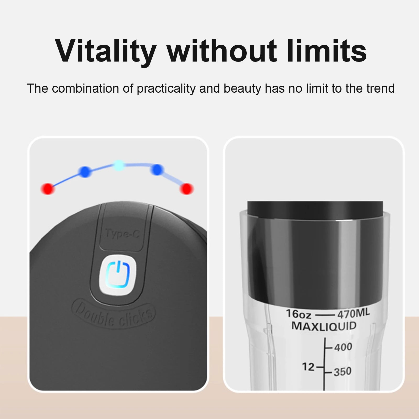 3.【Portable & Perfect Capacity】With a large capacity of 470ml, this juice mixer has enough space to put fruits, vegetables and ice cubes in it.